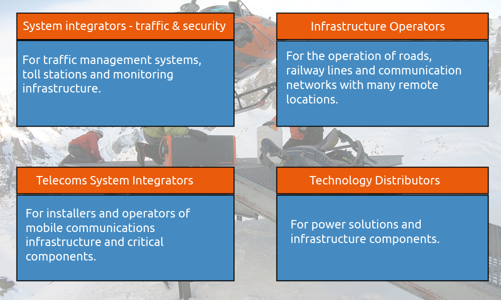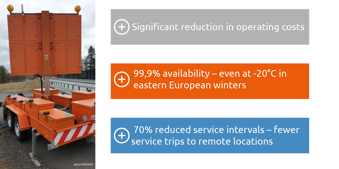 Traffic monitoring: The expansion of intelligent transport systems is progressing. New monitoring and control systems as well as roadside units require off-grid power supply. Many of these locations are outside the power grid or only in temporary use.